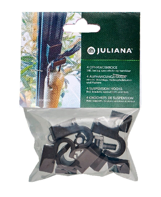 havehandsker eller haveredskaber på. En pakke indeholder fire kroge i sort plast samt beslag,