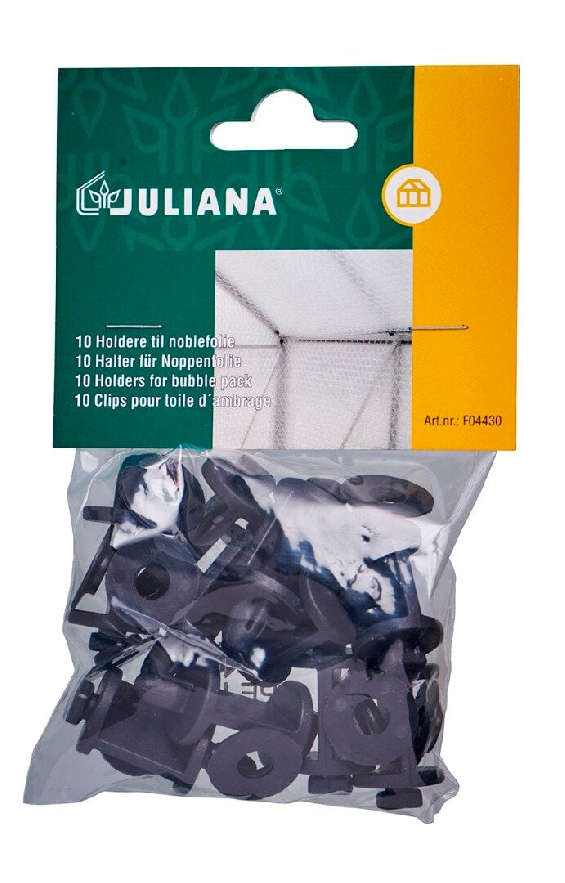 Juliana isoleringsplastholdere letter montagen af isoleringsfolie og skyggenet i drivhuset. De monteres let i drivhusets profilsystem. Posen indeholder 10 stk.