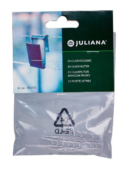 Juliana Glasholdere - 15 stk. Juliana glasholdere bruges til montage af glas. Glasholderen har et buk, det andet laver du selv, når du monterer glasset. Ligger i en pose med 15 stk.