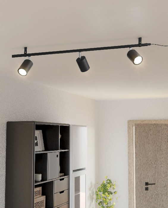 EGLO PORTELLA spotskinne i sort og børstet stål, 3L. Højde 17 cm, længde 80 cm, bredde 6 cm. GU10, 3 x 3 watt, 250 lumen, 3000 kelvin. IP20. Dette produkt indeholder lyskilder med energieffektivitetsklasse: F.
