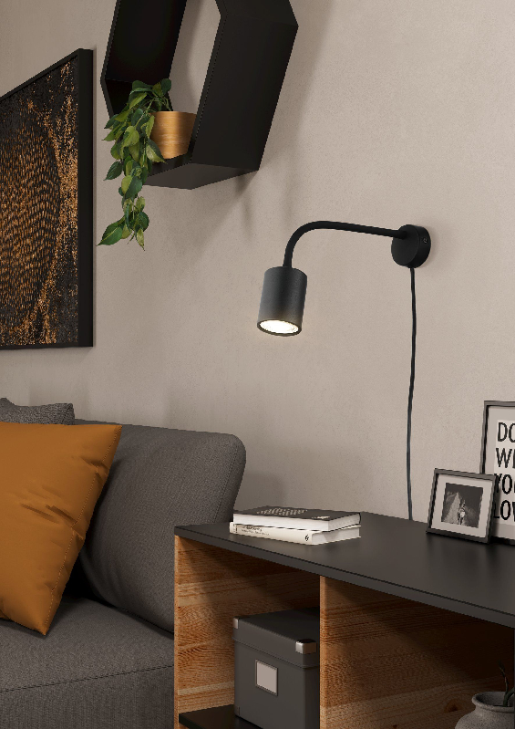 EGLO PORTELLA spot med flexarm i sort og børstet stål. Med gennemgangsafbryder. Højde 6,5 cm, længde 6 cm, dybde 37 cm. GU10, 3 watt, 250 lumen, 3000 kelvin. IP20. Dette produkt indeholder en lyskilde med energieffektivitetsklasse: F.