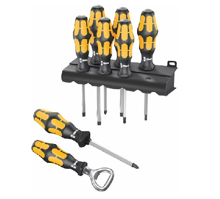 7-delt skruetrækkersæt samt en flot Wera-flaskeåbner. Den gennemgående klinge i håndtaget garanterer tabsfri kraftoverførsel. 7-delt Wera skruetrækkersæt til skruning, mejsling og til at løsne meget hårdt spændte skruer. Kraftform-multikomponenthåndtag for hurtig og komfortabel brug.