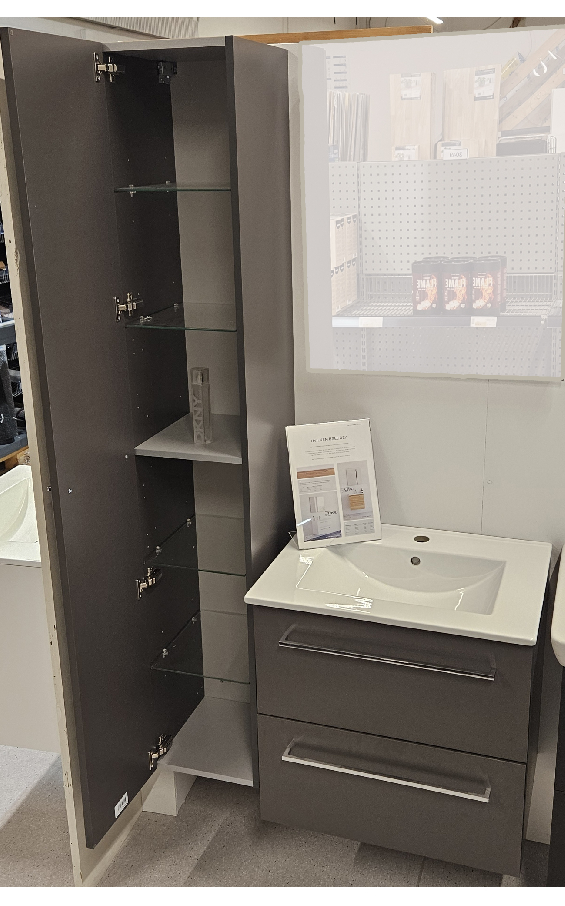 Scanbad Dina Møbelpakke mat grå 45,5 cm dyb porcelænsvask i moderne og stilrent design. Vaskeskab med 2 skuffer med fuldt udtræk, softclose og greb i krom. Inkl. spejl